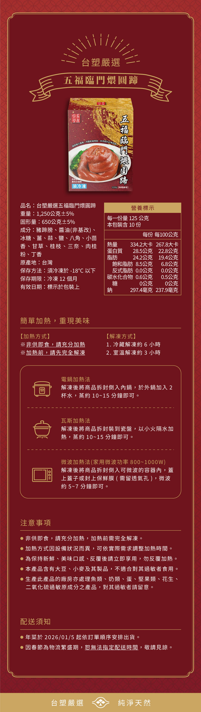 成份:豬蹄膀(台灣)、醬油(非基改)、冰糖、薑、蒜、鹽、八角、小茴香、甘草、桂枝、三奈、肉桂粉、丁香。