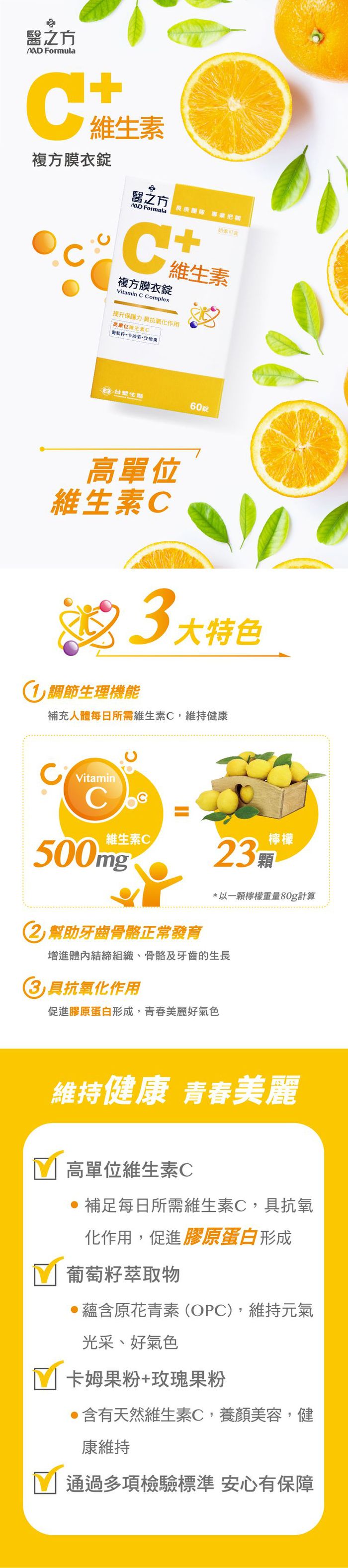 內容物成分: 維生素C(維生素C、玉米澱粉)、玉米糖漿粉、乳糖、葡萄籽萃取物(葡萄籽萃取物、麥芽糊精)、卡姆果粉(卡姆果粉、麥芽糊精)、玫瑰果粉、硬脂酸鎂、聚乙烯吡咯烷酮