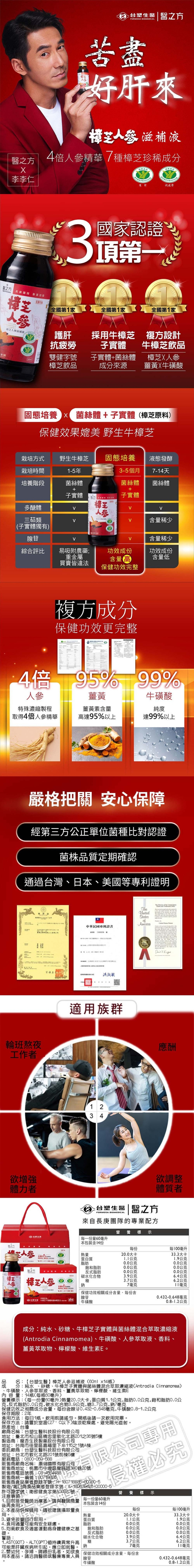 成 分:純水 、砂糖、牛樟芝子實體與菌絲體混合萃取濃縮液(Antrodia Cinnamomea)、牛磺酸、人參萃取液、香料、薑黃萃取物、檸檬酸、維生素E