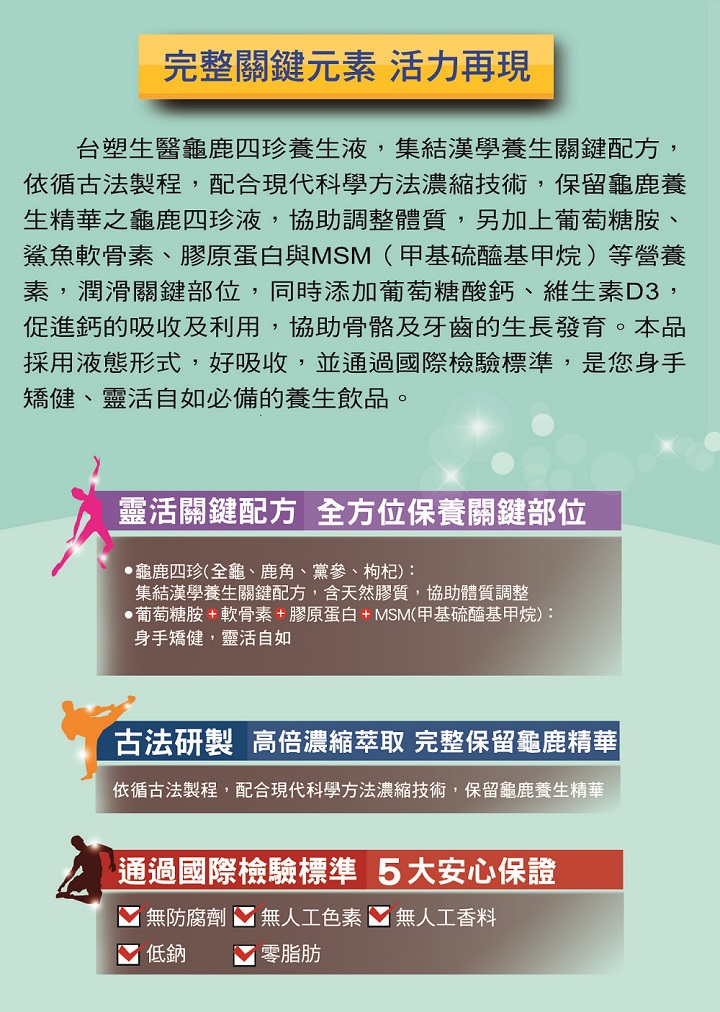 內容物成分:純水、漢方龜鹿四珍膠(鹿角、全龜、黨參、枸杞)、黑棗濃縮汁、冰糖、D-山梨醇液(甜味劑)、葡萄糖胺鹽酸鹽、甲基硫醯基甲烷(甲基硫醯基甲烷、二氧化矽)、葡萄糖酸鈣、玉米糖膠、膠原蛋白、鯊魚軟骨粉、DL-蘋果酸、蔗糖素(甜味劑)、維生素D3【糖、麥芽糊精、阿拉伯膠、葵花籽油、磷酸鈣、維生素D3、維生素E(抗氧化劑)】