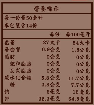 營養標示: (每一份量50毫升) 熱量27大卡、蛋白質0.9公克、脂肪0公克、飽和脂肪0公克、反式脂肪0公克、碳水化合物5.8公克、糖3.8公克、鈉6毫克、鉀32.3毫克