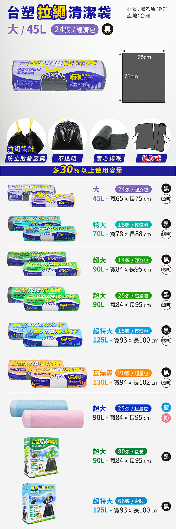 【 台塑 拉繩 清潔袋 垃圾袋 (大) (黑色) (45L) (65*75cm) (15捲)】
