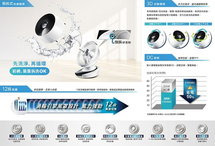 產品規格: 型號: DF-10A0CD 扇葉尺吋: 10 吋 扇葉片數: 3片 風速段數: 12段 風類模式: 一般風/ECO 擺頭調整: 3D立體擺頭(上下/左右) 最大消耗功率: 28W BSMI:R63080