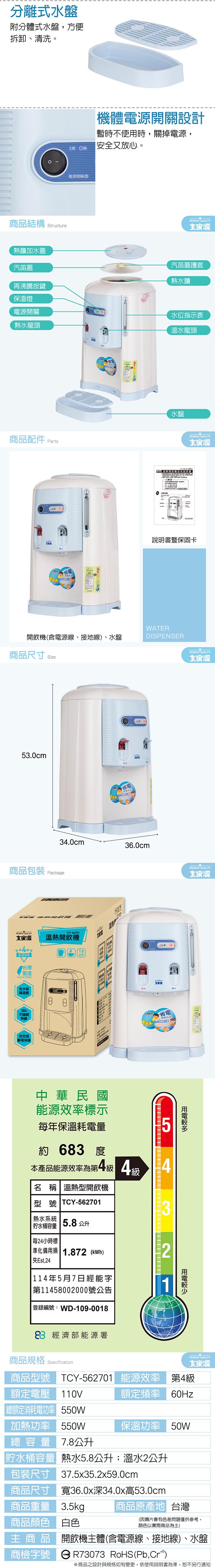 大家源 304不鏽鋼內膽溫熱開飲機7.8L TCY-562701 台灣製