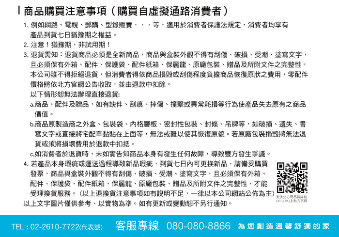 注意!猶豫期非試用期,辦理退貨商品必須是全新狀態且包裝完整,否則將會影響退貨權限