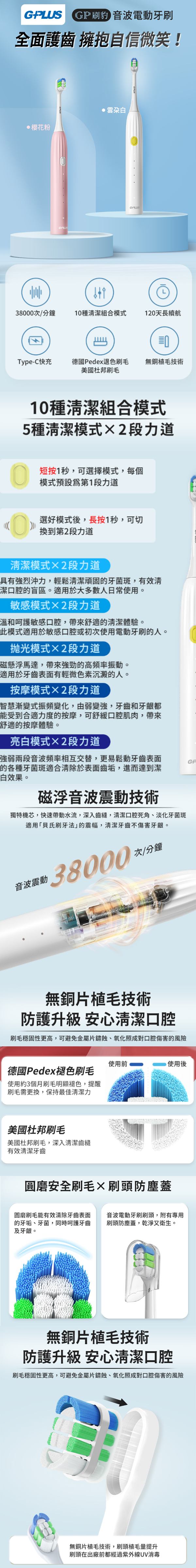 GPLUS音波電動牙刷(ET-A003S)具備全方位貼心呵護,並採用德國Pedex退色刷毛+美國杜邦刷毛,能減少牙齦出血及敏感性牙齒等問題;並具備五種(清潔、敏感、拋光、按摩、亮白)清潔模式、每種模式還可切換2段力道,確保您的口腔潔淨;此外,它具備無銅片植毛技術,刷毛穩固性更高,同時可避免金屬片鏽蝕、氧化照成對口腔傷害的風險--防護升級、安心清潔口腔。