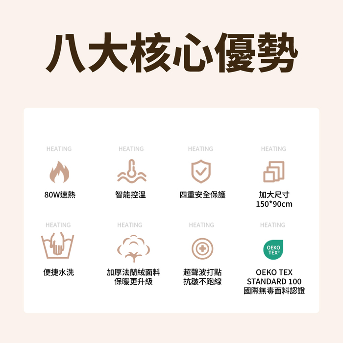 ●四重安全防護:過熱斷電、阻燃絕緣、短路保護、自動恆溫