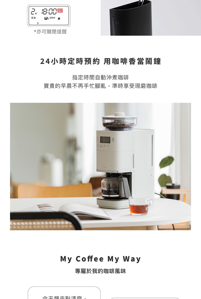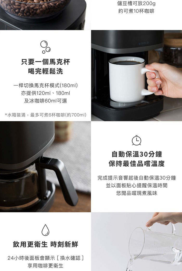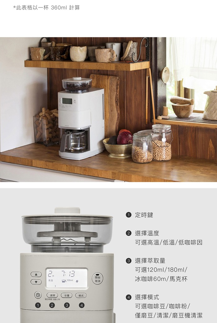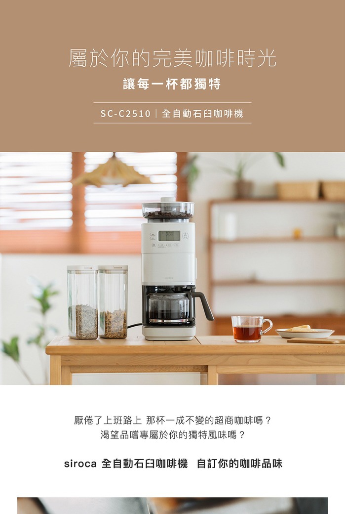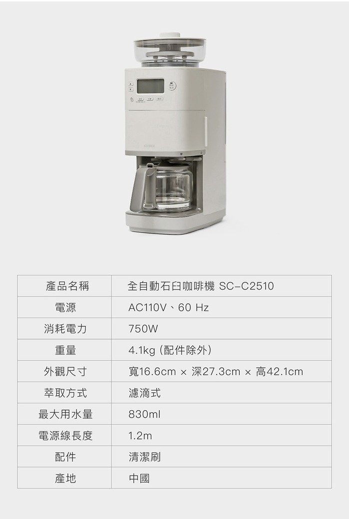 產品名稱:全自動石臼咖啡機 SC-C2510 電源:AC110V、60Hz 消耗電力:750W 重量:4.1kg(配件除外) 外觀尺寸:寬16.5cm x 深27.3cm x 高42.1cm 萃取方式:濾滴式 最大用水量:830ml 電源線長度:1.2m 配件:清潔刷 顏色:淺灰白 產地:中國 商檢字號:R31310