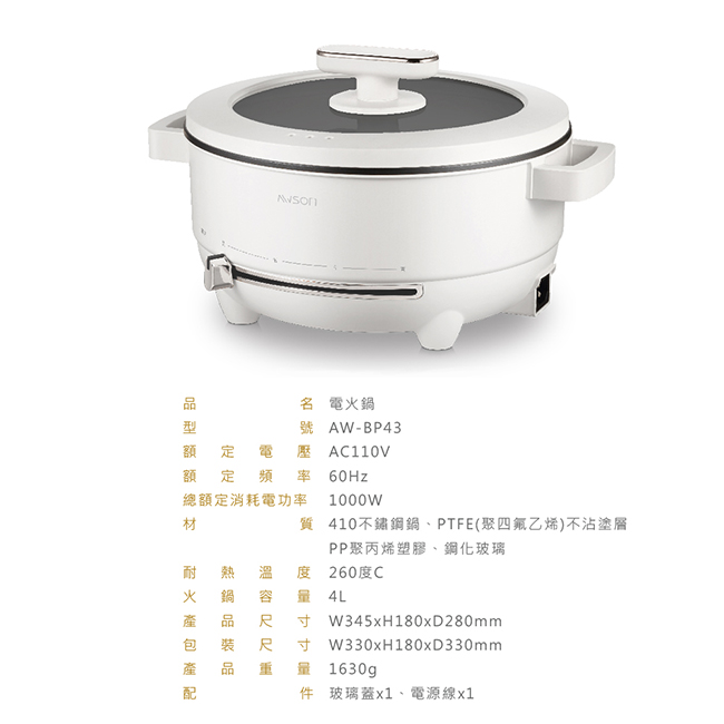 材質:410不鏽鋼鍋、PTFE(聚四氟乙烯)不沾塗層、PP聚丙烯塑膠、鋼化玻璃