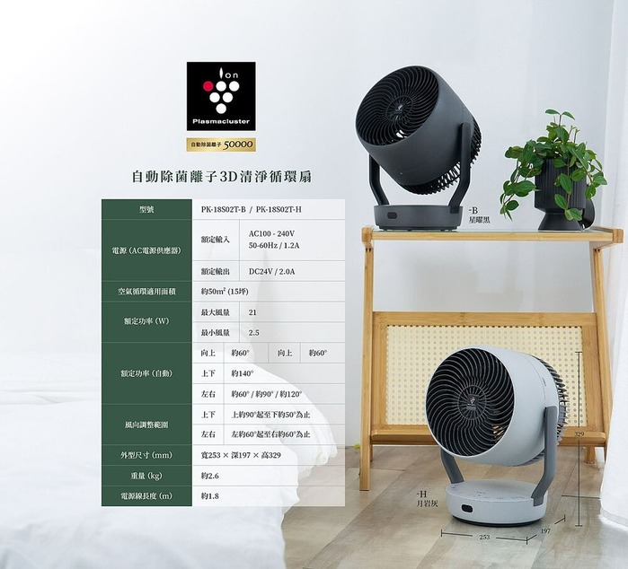 品名:SHARP 夏普 自動除菌離子3D清淨循環扇 星耀黑PK-18S02T-B / 月岩灰PK-18S02T-H