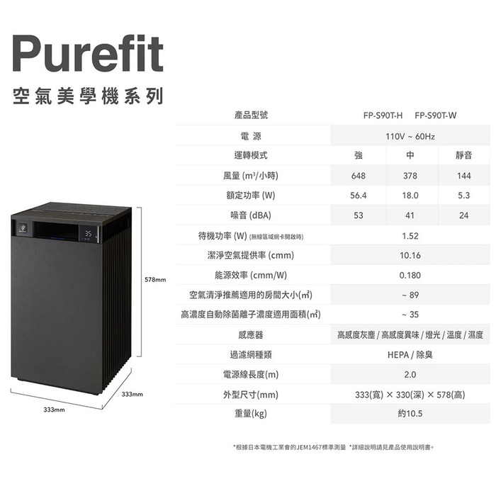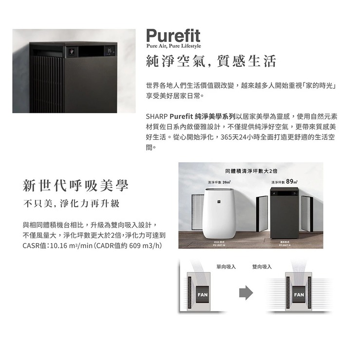 品名:SHARP夏普 27坪Purefit純淨空氣美學自動除菌離子空氣清淨機FP-S90T-H 棕/FP-S90T-W 白