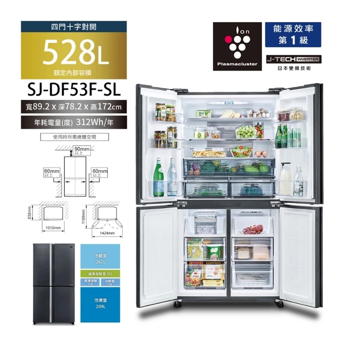 品名:SHARP 夏普 SJ-DF53F-SL 528L自動除菌離子四門變頻冰箱