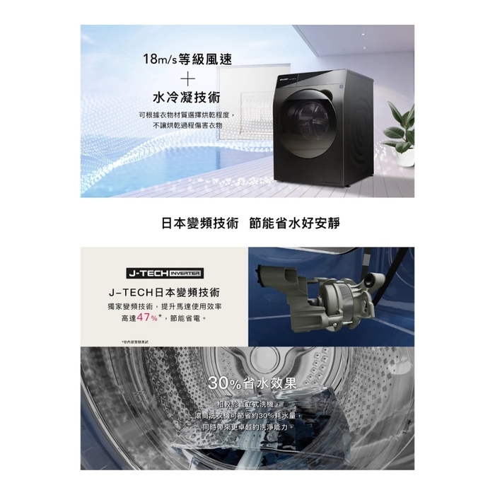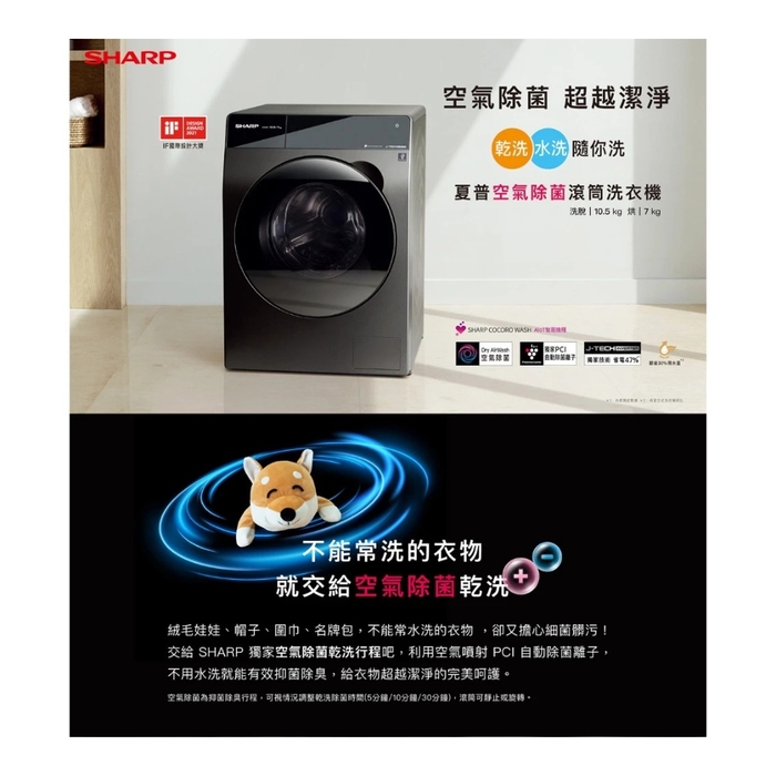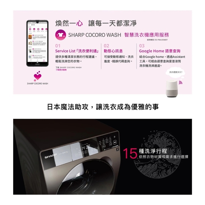 品名:SHARP 夏普 10.5KG ES-FKA105WDT 變頻溫水洗脫烘滾筒洗衣機