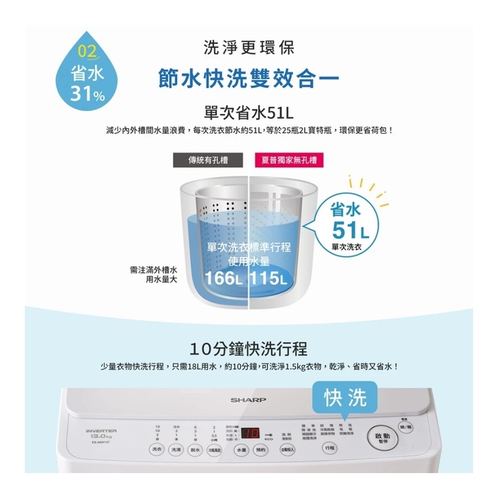 【 SHARP 夏普 13KG ES-ASW13T無孔槽抗菌洗衣機-新增自動投劑】