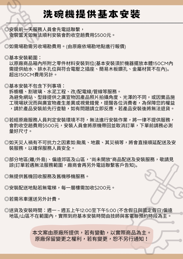 ◎基本安裝不包含下列事項:拆櫥櫃、割玻璃、水泥工程、改/配電線/管線等服務。
