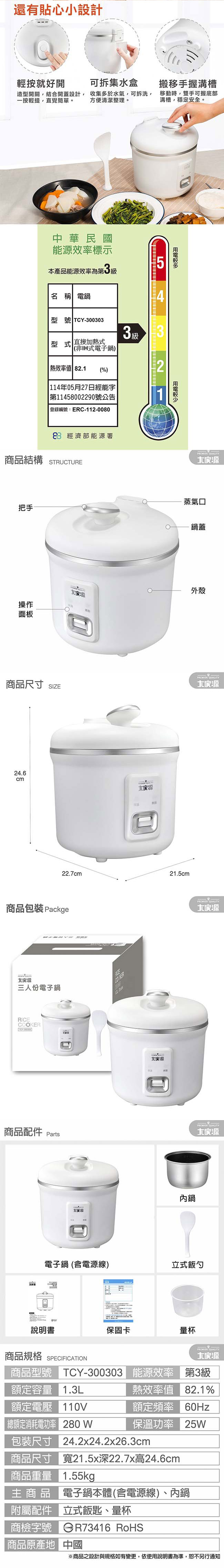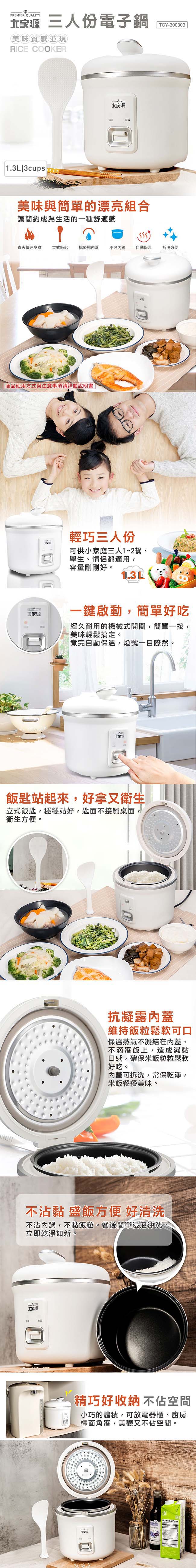 大家源 三人份電子鍋1.3L(附量杯+飯匙) TCY-300303