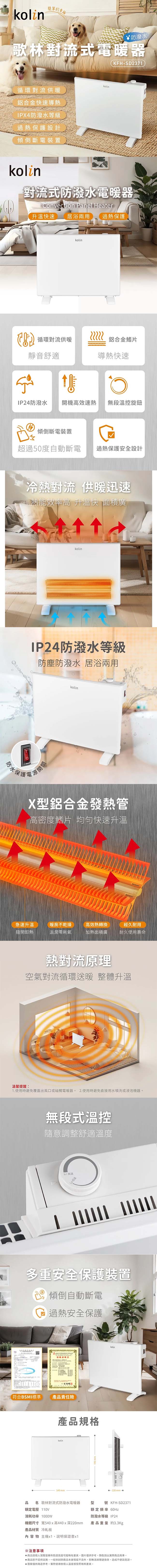 歌林Kolin 防潑水浴室對流式電暖器 KFH-SD2371