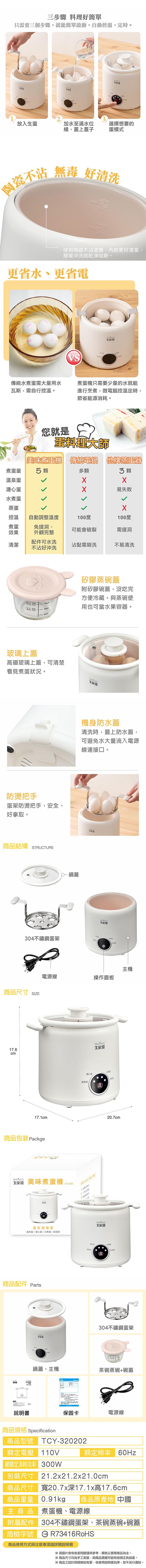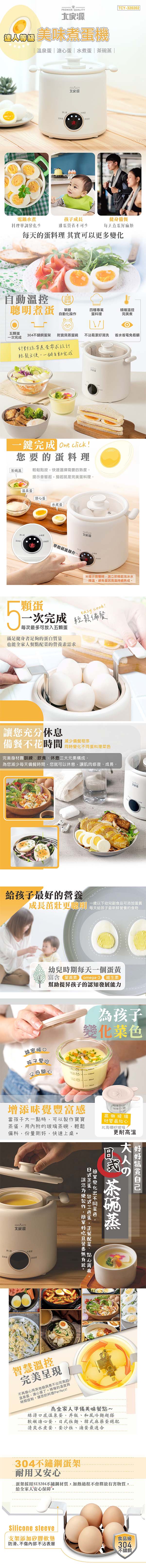 大家源 四種模式美味5顆蛋煮蛋機0.7L(304不鏽鋼蛋架+玻璃茶碗蒸碗含蓋) TCY-320202