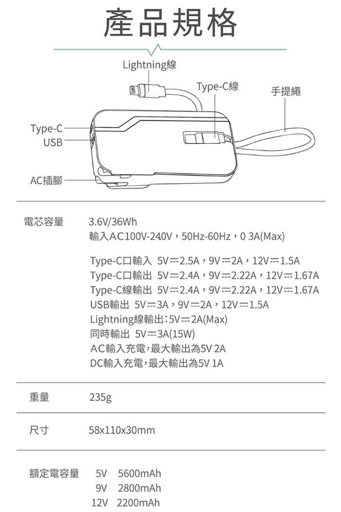 Type-C口輸出 : 5V=2.5A,9V=2.22A,12V=1.67A