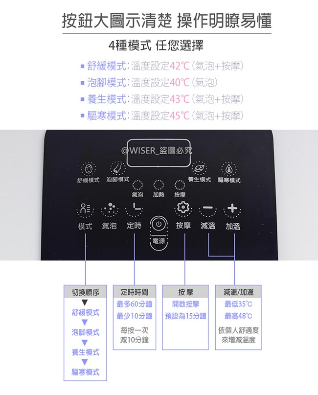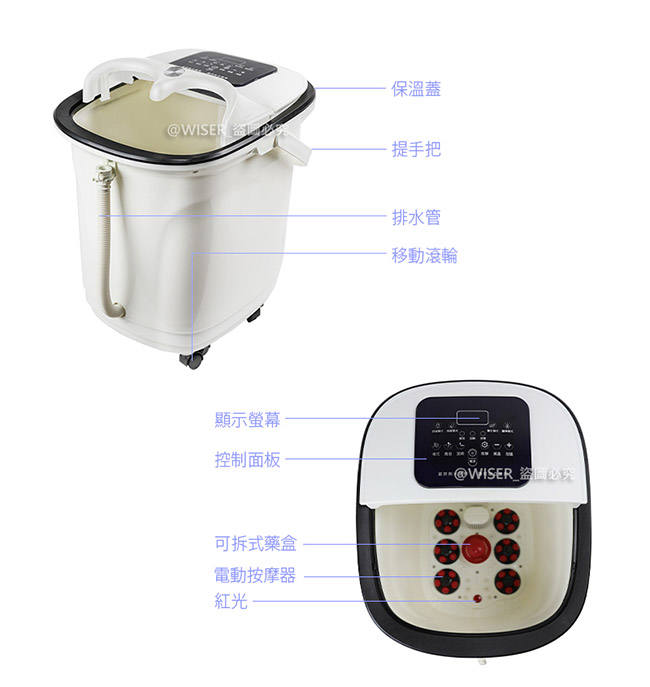 ★放心:第一老品牌,品質保證★真心:四模式選擇,舒壓保健★用心:電動六滾輪,乾溼兩用★貼心:提手排水管,移動輪設計