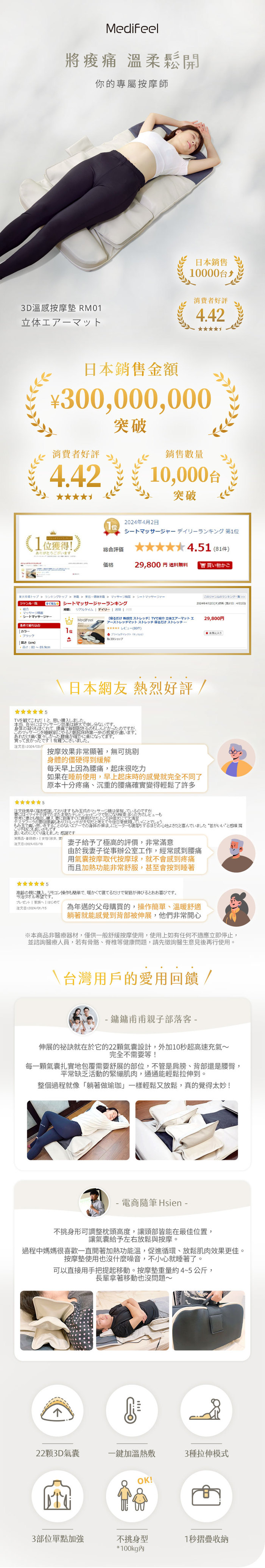 ◆日本樂天銷售第一,4.42顆星好評,累計銷售超過1萬台、日圓3億。