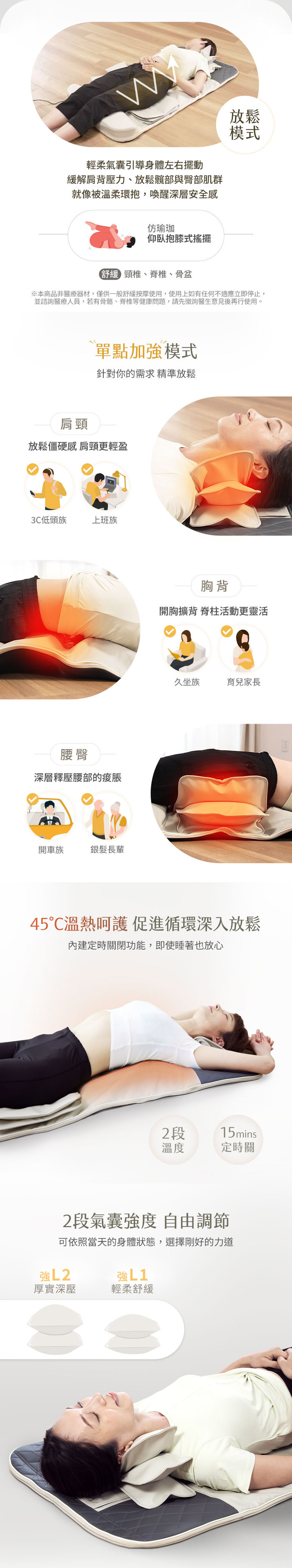 ◆肩頸、胸背、腰臀共3個單點加強模式,緩解局部疼痛。