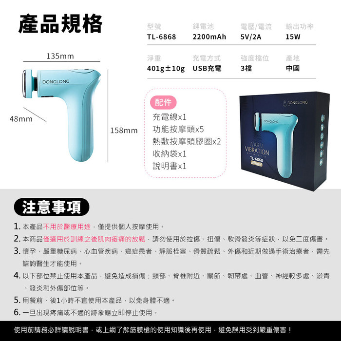 配件:充電線x1、功能按摩頭x5、熱敷按摩頭膠圈x2、收納袋x1、說明書x1