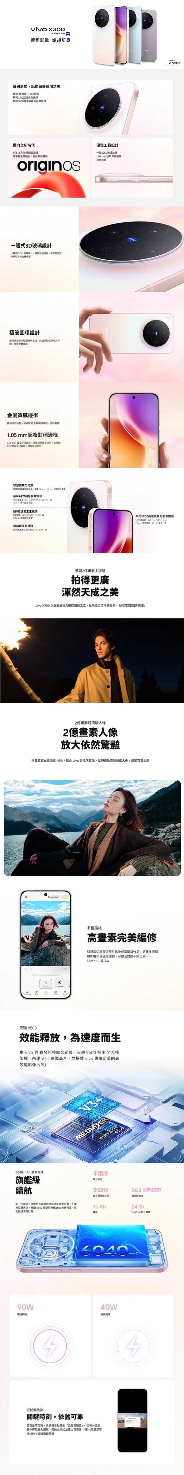 vivo X300搭載聯發科天璣9500旗艦平台八核心CPU、台積電第三代3奈米製程,並採用全大核架構,內建V3+影像晶片,且搭載vivo專屬定義的高效能影像NPU,更能實現雙晶片深度協同運算,提供強大的影像處理效能與能源效率;此外,它搭載第二代半固態大容量藍海電池,擁有6,040 mAh大電量,並且最高支援90W有線閃電快充、40W無線閃充,可在短時間內迅速替手機回血,滿足您長時間使用需求!