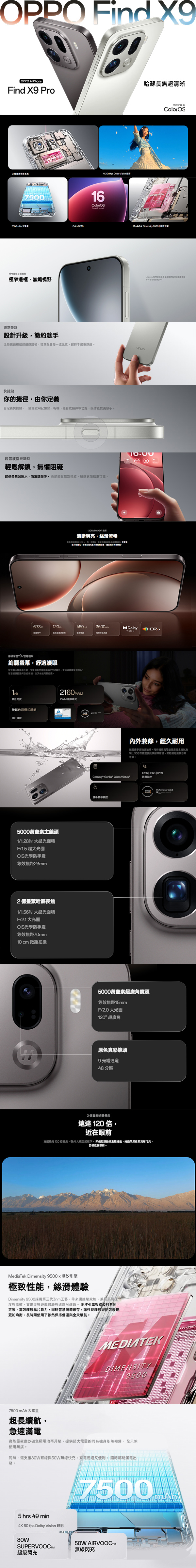 OPPO Find X9 Pro採用Android 16作業系統、ColorOS 16操作介面,搭載3奈米製程的聯發科天璣9500八核心處理器,內建16GB RAM+512GB ROM、以及擁有5G上網、eSIM、WiFi、藍牙6.0、NFC等豐富實用功能;結合潮汐引擎以及系統級智慧記憶體調節技術,能確保系統流暢度,並可降低大型手遊耗能、再結合高性能石墨與更大散熱板的冰河散熱系統,高負載狀態也能保持穩定運行;此外,它配備7, 500 mAh大電量電池,支援80W SuperVOOC有線超級閃充、50W AirVOOC無線閃充,擁抱充電新趨勢,高速更便利。