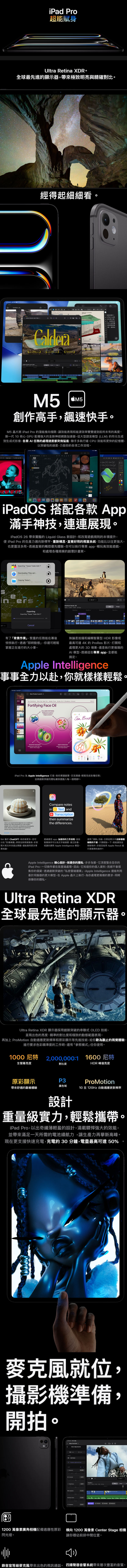 ◎螢幕:13吋Ultra Retina XDR顯示器、串聯式OLED技術、2752 x 2064 pixels解析度、ProMotion技術,支援10Hz至120Hz、自動適應更新頻率、廣色域(P3)、原彩顯示、防指印疏油外膜、全平面貼合、抗反射鍍膜、SDR亮度:1000尼特最大亮度;XDR亮度:1000尼特最大亮度(全螢幕),1600尼特峰值亮度(僅限HDR內容)、1尼特最低亮度、2,000,000:1對比度、支援Apple Pencil Pro、支援Apple Pencil(USB‑C)、Apple Pencil懸浮功能、264 ppi