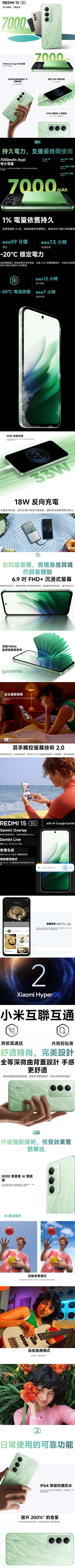 紅米Redmi 15 5G (8G/256G版)後置5,000萬畫素AI主鏡頭+輔助鏡頭,並提供自動夜景模式、AI魔法換天、最高30fps的1080P錄影功能,能有效提升細節與成像品質,拍攝畫面更清晰、明亮;同時更導入動態照片、AI魔法消除等攝影功能,不僅方便捕捉稍縱即逝的瞬間,也能在拍完照片後輕鬆將背景路人給移除喔!此外它前置800萬畫素自拍鏡頭,支援AI臉部解鎖與人像美顏,隨手一拍都能展現自然動人的膚質與神采!並且,您可在螢幕上搜尋任何圖片、影片或文字--圈選、反白、塗鴉或點按一下以指出您感到好奇的事物,無須使用螢幕擷取畫面;另也可與Google的AI助理Gemini聊天,讓想法更有力--獲得寫作、腦力激盪與學習等方面的協助。