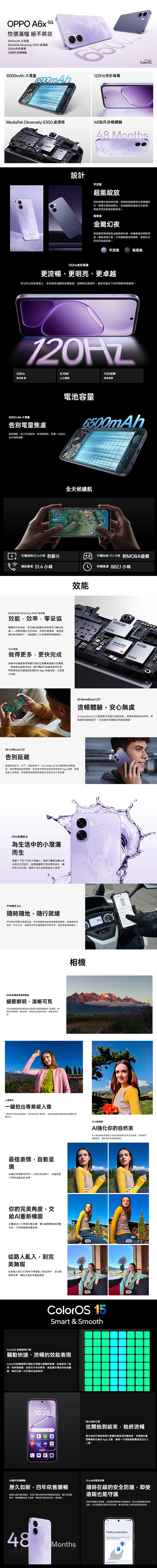 OPPO A6x 5G後置5,000萬畫素主鏡頭+200萬畫素景深鏡頭 ,無論是壯闊風景、食物特寫、藝術作品或自然景色,都能完美呈現。支援AI最佳表情、AI人像美顏等功能,搭配人像模式可輕鬆拍出夢幻虛化的人像照片,完美呈現專業景深與細節的珍貴時刻;並前置500萬畫素自拍鏡頭,能紀錄每一刻自然真實的你(妳),讓您的拍攝樂趣倍增,把握每個角度的美好瞬間!此外,內建AI GameBoost 2.0,系統會智慧分配晶片運算效能,即使在高溫或長時間、高強度的遊戲情境下,也能確保流暢穩定的遊戲體驗。