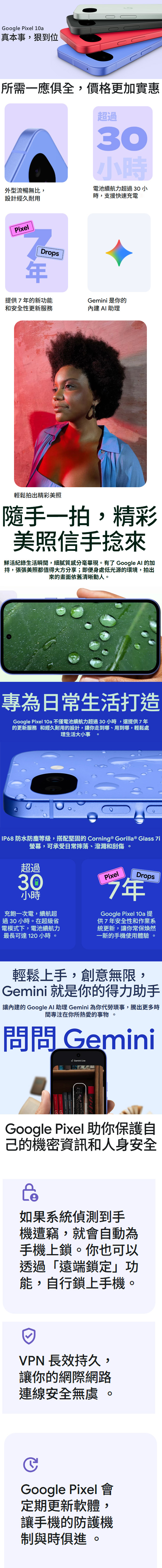 Google Pixel 10a 5G (8G/256G版)採用全平面設計,使鏡頭模組與背面完美融合,同時進一步提高環保材料的再利用率,並擁有6.3吋Actua螢幕、2,424 x 1,080 pixels解析度,具備20:9顯示比例,支援60~120Hz自動更新率,螢幕峰值亮度最高可達3,000nit,戶外陽光照射下也能看清楚畫面內容。並提供螢幕指紋辨識、人臉解鎖功能,可確保個人隱私不輕易外洩;此外,它具備IP68防塵防水等級,滿足日常防護所需。(註:它可防水防塵。所有連接埠和連接的保護蓋都應緊閉。請勿將裝置完全置於水中,或暴露於海水、鹽水、氯化消毒過的水或飲料等液體中。誤用和不當使用本裝置將會導致保固失效,且潮溼狀態不可充電,以免危險,若產生充電毀損者不在保固範圍內!另,配件也不具備防塵抗水功能)。