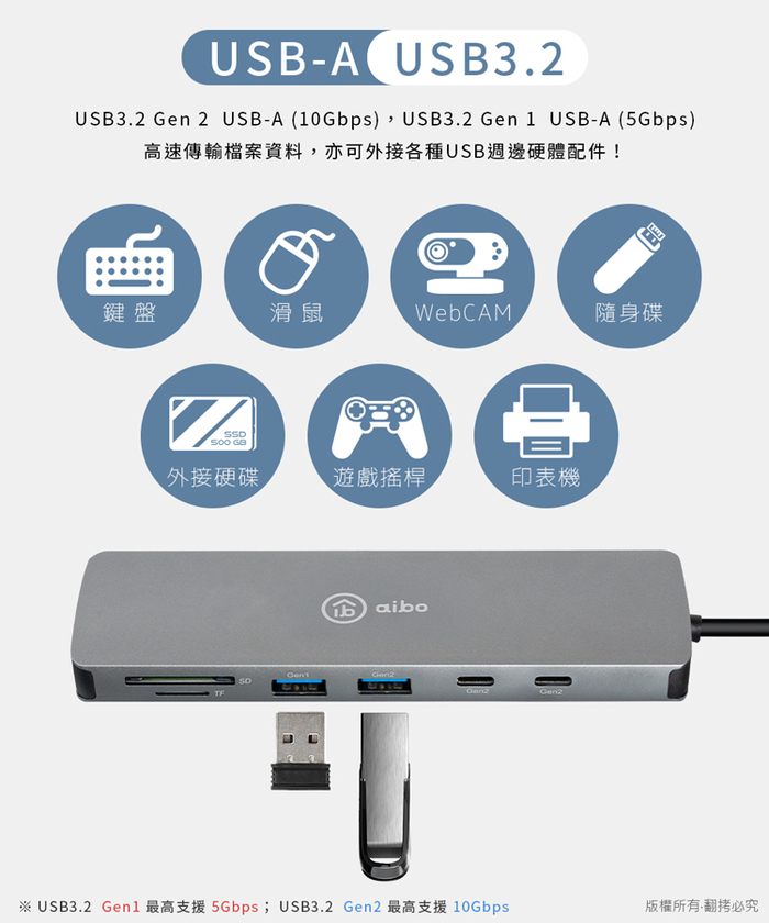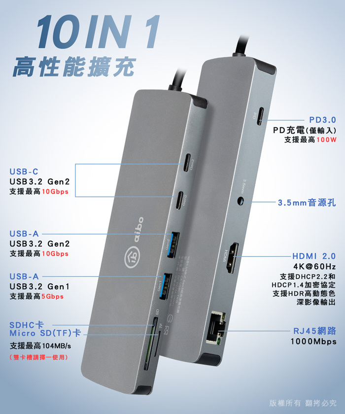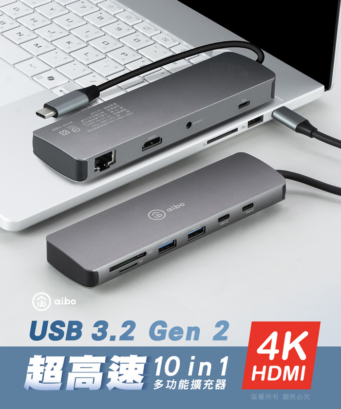 .產品名稱:aibo 10合1 USB-C Gen2 超高速多功能擴充器