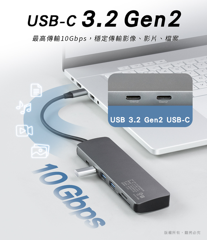 有效解決孔位不足、資料傳輸速度緩慢等各種使用痛點。搭載 USB 3.2 Gen2 USB-C/USB-A (最高10Gbps )