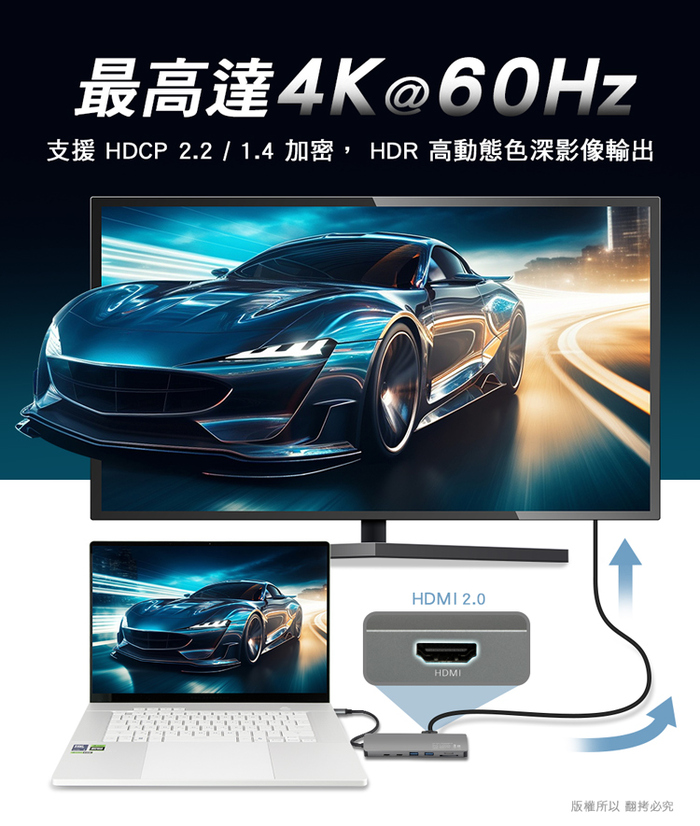 HDMI 4K@60Hz 高畫質輸出,支援 HDCP 2.2 及 HDCP 1.4 加密協定,支援 HDR 高動態色深影像輸出,