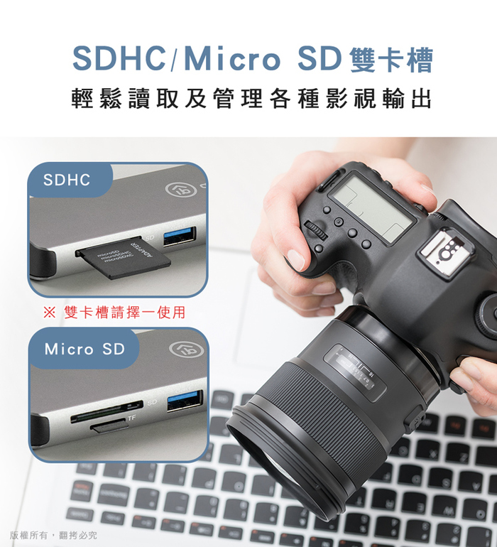 ● 記憶卡插槽:支援讀取 SDHC、Micro SD(TF),最高讀取速度達 104Mbps。※雙卡槽僅能擇一使用。