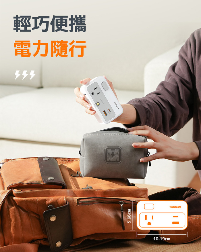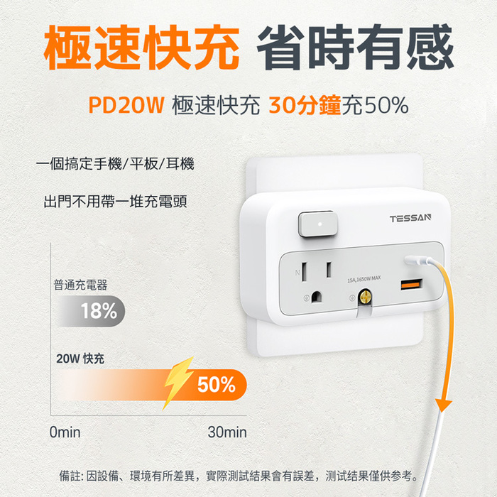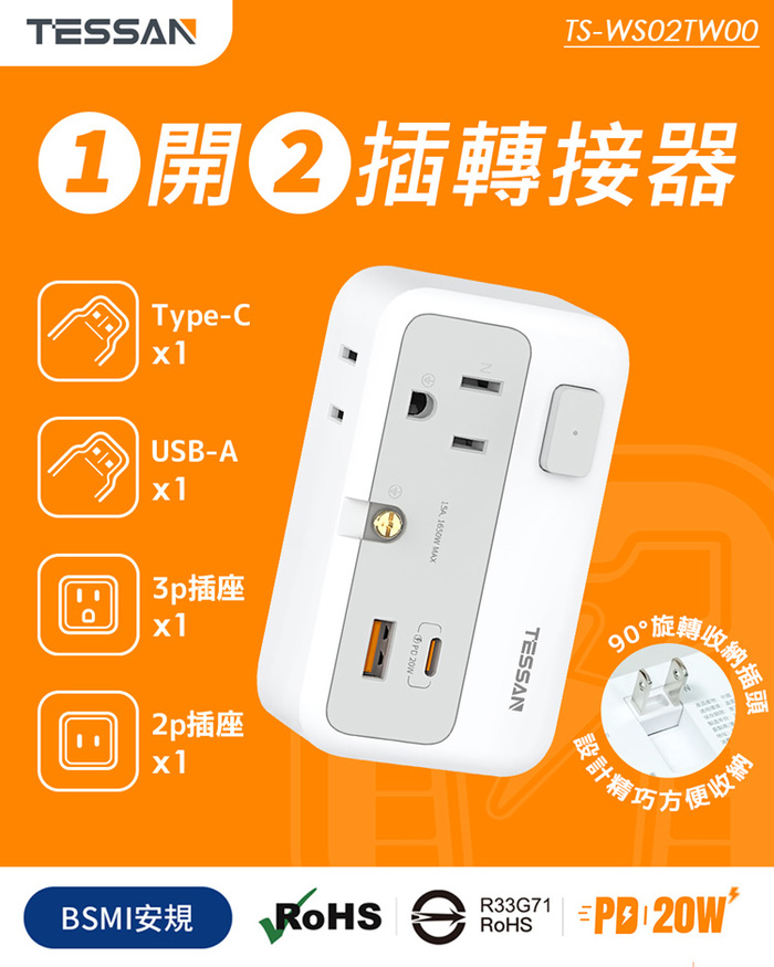 .品 名:TESSAN 1開2插轉接器(USB+PD20W快充)