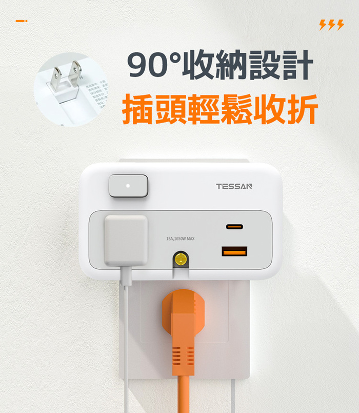 --2P插座+3P插座+USB+Type-C,多功能充電,90°折疊插頭--