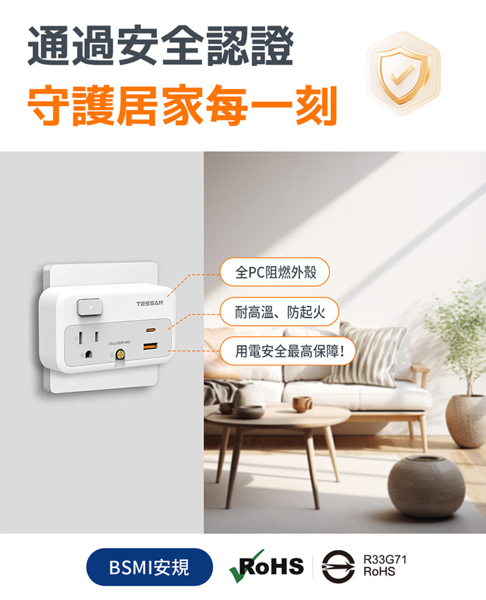 TESSAN 1開2插轉接器(USB+PD20W快充)★通過安全認證★