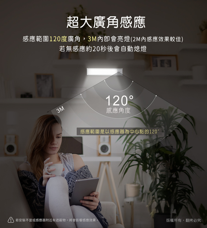 感應範圍為120度廣角,距離3M以內(2M內感應效果較佳)