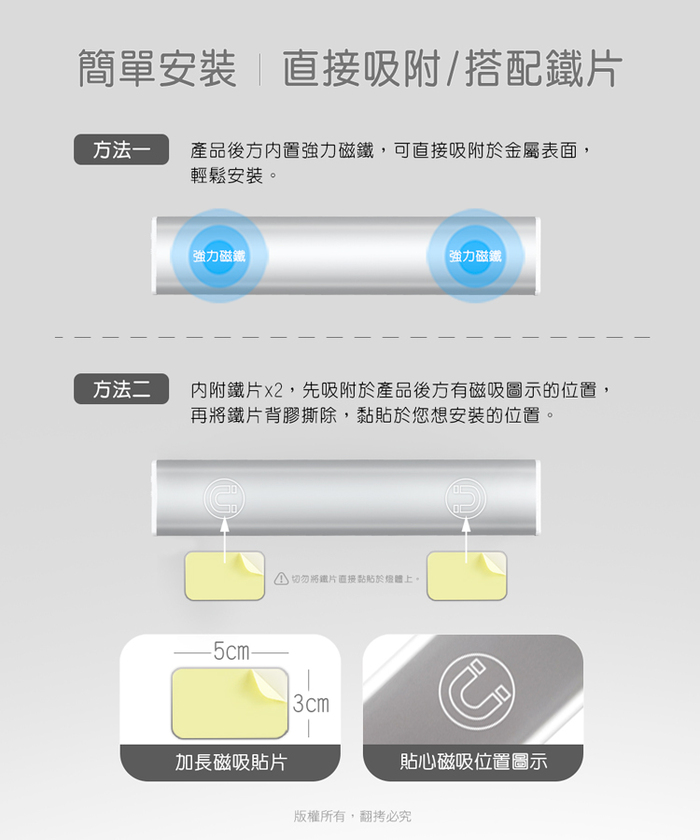 ◆磁吸式固定,安裝拆卸方便,搭配內附加長型鐵片更加牢固,非金屬表面亦可使用