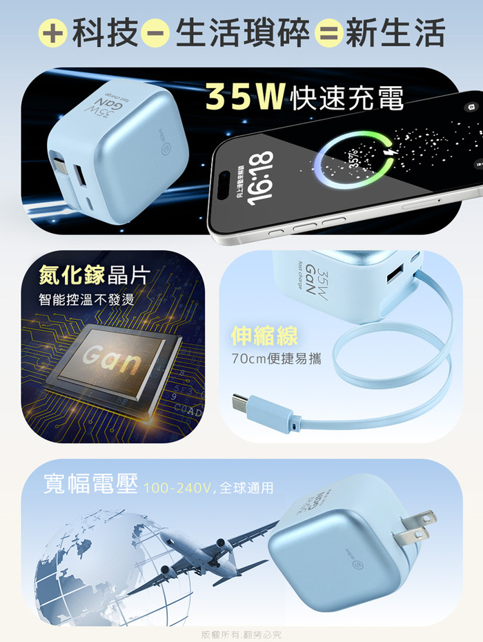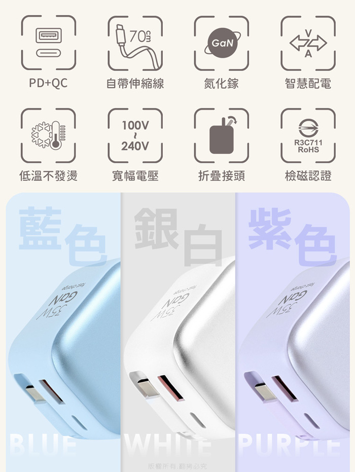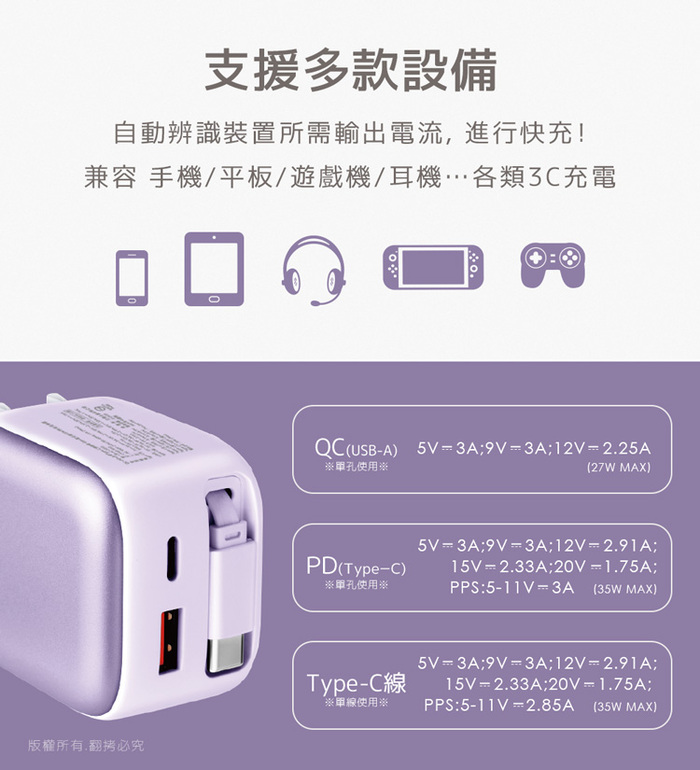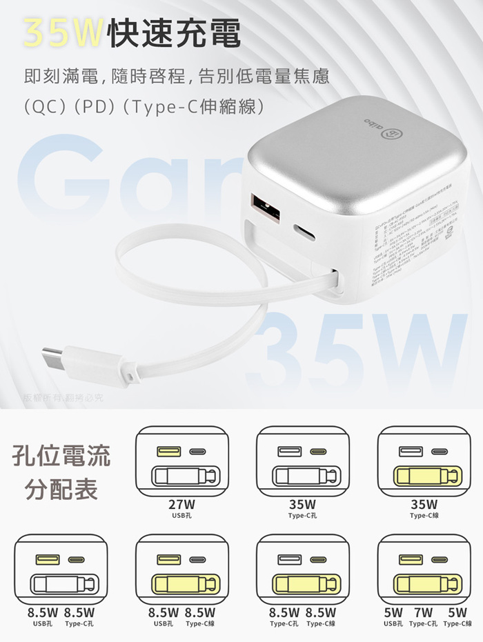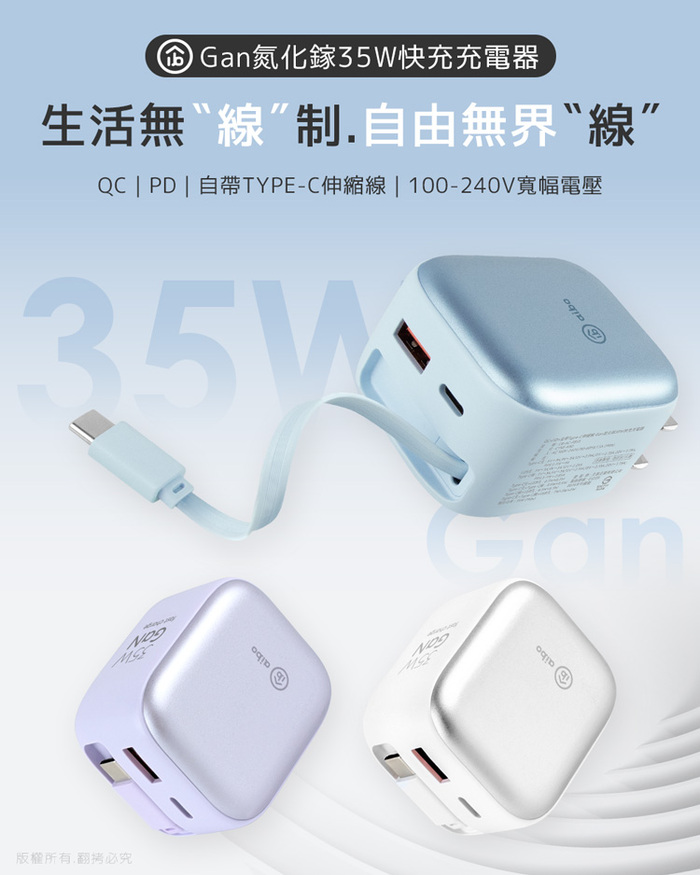 .商品名稱:aibo QC+PD+自帶Type-C伸縮線 Gan氮化鎵35W快充充電器