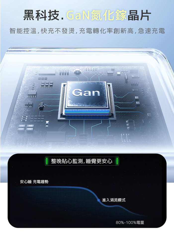 採用GaN氮化鎵芯片,支援高功率輸出,溫控及穩定性更好,