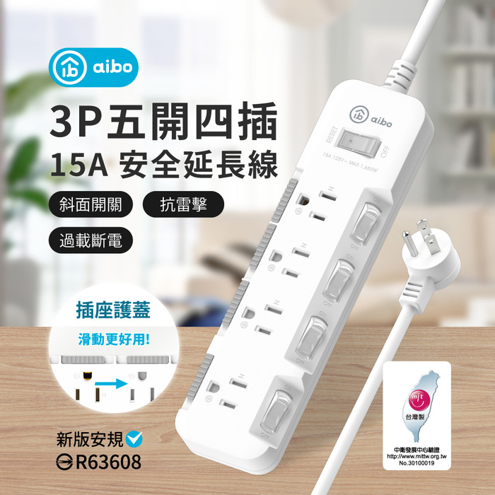 .商品名稱:aibo 5開4插 3P防塵蓋抗雷擊延長線(斜面開關)