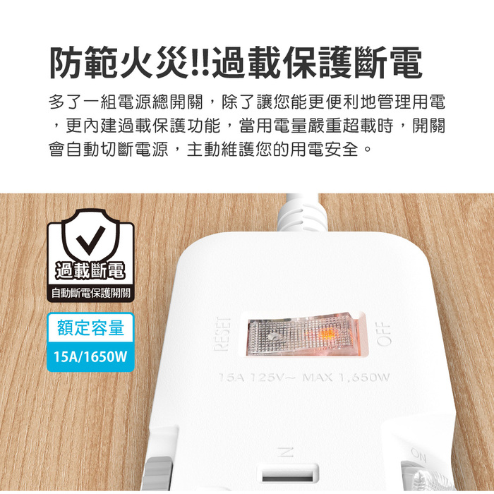 電路中每一個接合處都會造成阻抗增加,進而潛藏燒熔風險。本產品內部開關與插座採用一體成型設計製造,