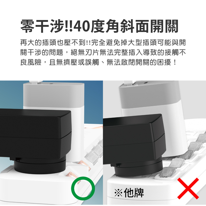 完全避免掉大型插頭可能與開關干涉的問題,絕無擠壓或誤觸開關的困擾!末端空間加大插座設計,