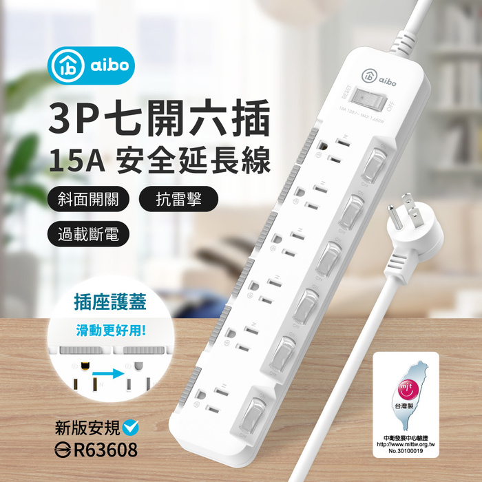 .商品名稱:aibo 7開6插 3P防塵蓋抗雷擊延長線(斜面開關)