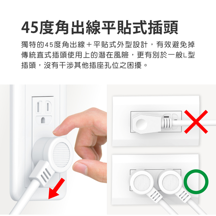 45°出線設計有別於一般直向插頭,使用時不易干擾到旁邊的插座。