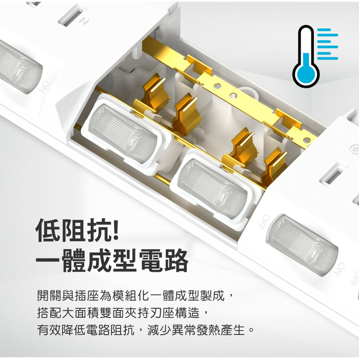 電路中每一個接合處都會造成阻抗增加,進而潛藏燒熔風險。本產品內部開關與插座採用一體成型設計製造,